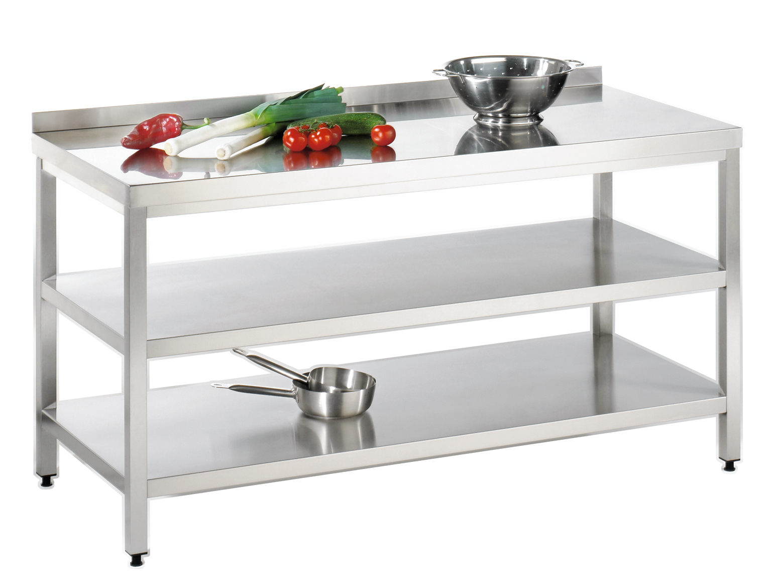 Work table, 2200x700x850mm, made of stainless steel 1.4301 without upstand, with shelf and middle shelf