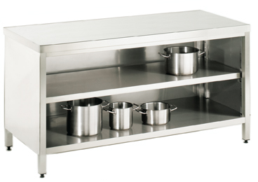Work cupboard, 400x700x850mm, made of stainless steel 1.4301 without upstand, with shelf and middle shelf, three-sided closed, open at front, 4 feet