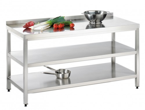 Work table, 1300x700x850mm, made of stainless steel 1.4301 without upstand, with shelf and middle shelf