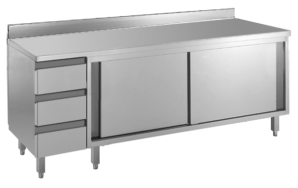 Cupboard, 1600x700x850mm, with drawer block LEFT, double-walled sliding doors, middle-shelf, adjustable feet, noise- and water insulated work top, CNS 18/10