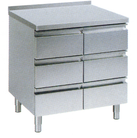 Drawer table, 800x600x850mm, CNS 18/10, with height adjustable feet, with upstand (100mm), noise insulated and water insulated work top, feet 160 mm, drawers GN1/1 (internal dimension: 305x529,2mm) drawer height external: 212,2 mm