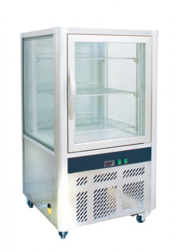 Cake Showcase 268 l, 706x706x1300mm, int. dim. 638x632x578mm ventilated cooling, four side safety glass, electric temp. controller, tem.+ 2 C - +10 C, 230V, 50 Hz, 96/106kg LED lamp at four corner, slots in 10 mm distances, incl. 2 shelfves