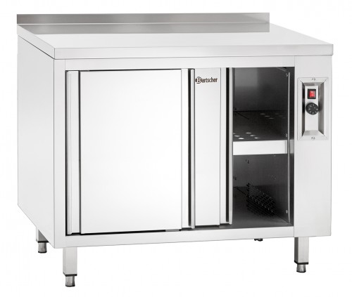Stainless steel Scotch-Brite polish, 40 mm bevelled edges with sliding doors intermediate shelf height adjustable Legs made of square-pipe 40 x 40 mm and adjustable to 50 mm. 40 mm splashback Power: 2 kW / 230 V Size: W 1200 x D 700 x H 850-900 mm Customized designs deliverable on request!