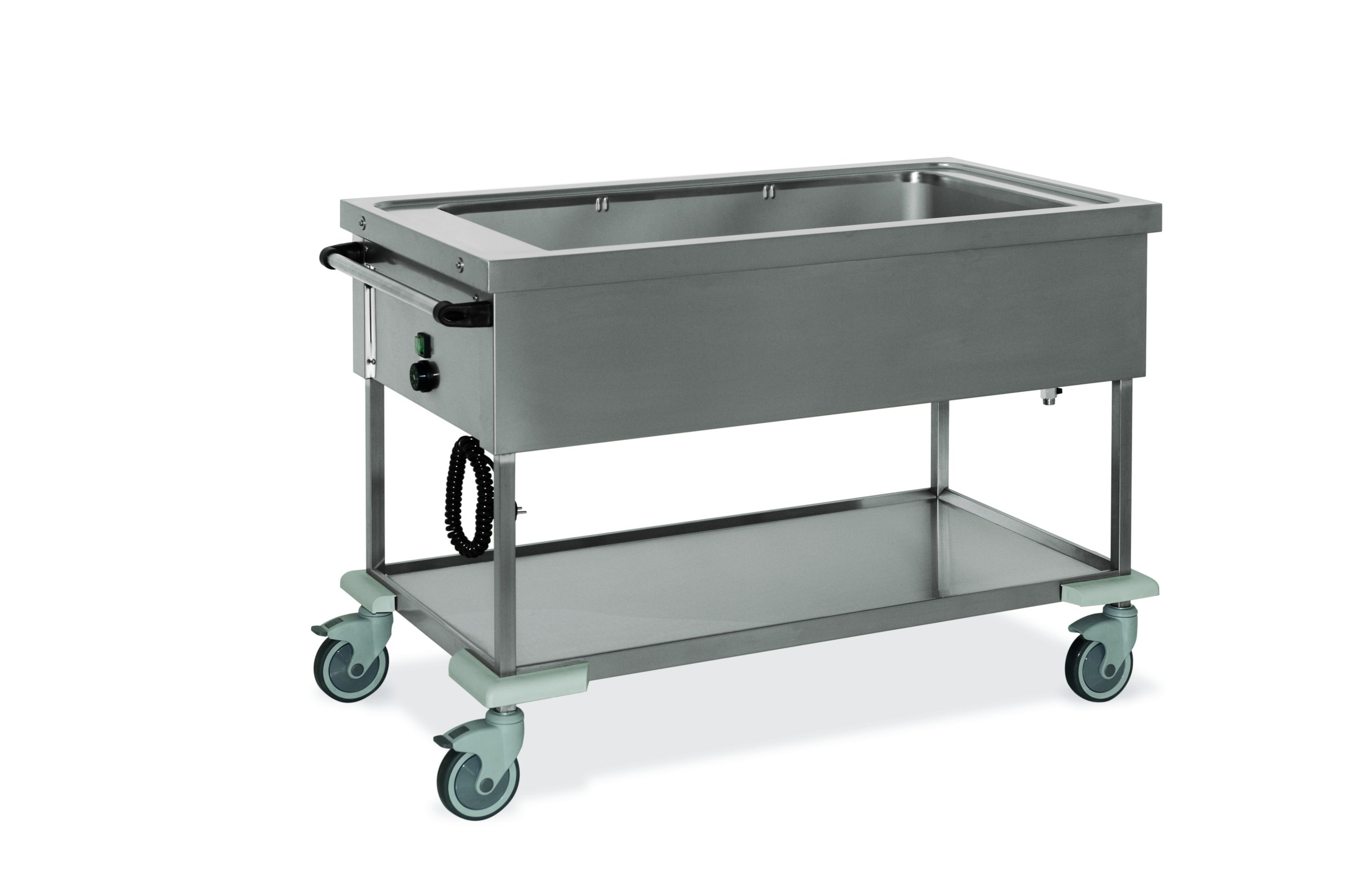 2.5x2.5cm square steel tube construction with AISI 304 stainless steel sheet panels, brushed finish Polyurethane foam insulation panels Heat-proof push handle Open sided base with welded shelf Single Bain Marie well in pressed steel sheet with no sharp edges; it can take up to 200mm deep GN pans (sold separately) Bain Marie drain tap Bain Marie dry heating element underneath the well ON/OFF switch with LED Control panel with thermostatic control from +30 °C to +90 °C Mains supply: 230V, 50/60 Hz, single-phase Rubber corner bumpers Swivel castors, Ø; 12.5cm Power 3x600 W. Max. dimensions 125x65x86cm