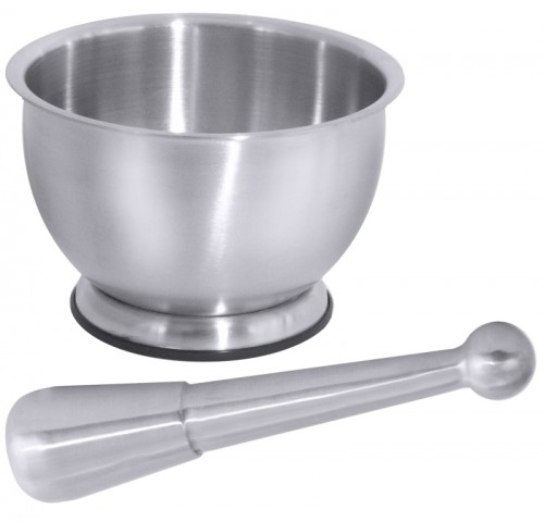 Mortar and Pestle stainless steel, satin polished, mortar base has plastic ring, pestle weight: 0.25 kg, heavy gauge