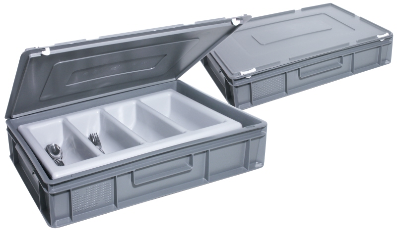 Transport/Storage Box for Cutlery high density polyethylene, takes cutlery box 56/550, adjustable and lockable lid, stackable, recyclable, heavy gauge