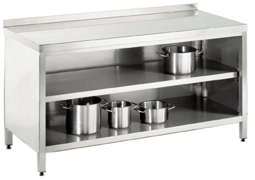 Armoire de travail 1700x600x850mm, Entierement en acier inoxydable 1.4301, avec dosseret 40mm, avec étagère et étagère intermédiaire. Trois-verso fermé, ouvert � l'avant, 4 pieds