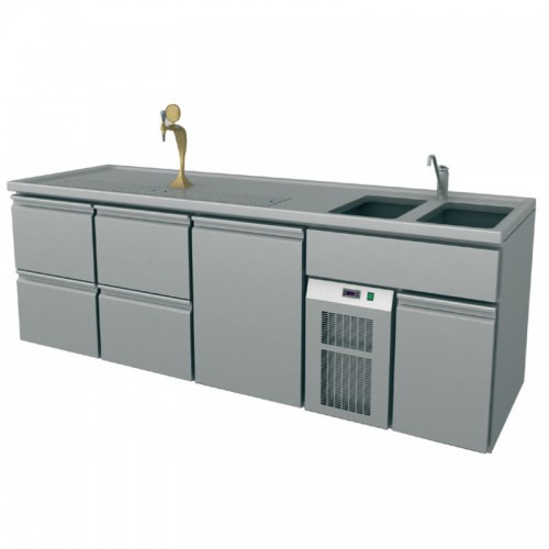 Comptoir � bar, 2545 x 700 x 900 mm, refroidissement ventilé, 500 W, 1 porte pour bouteilles ou fûts, 4 tiroirs pour bouteilles, 2 éviers � droite, robinet et pompe � bière non inclus