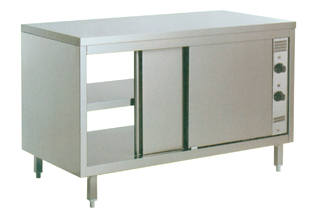 Hatch- and heated cupboards, 1200x700x850mm, CNS 18/10, with double-walled sliding doors and middle shelf, 2,5 kW, 230 V, air circulation up to +75°C, without upstand, noise- and water insulated worktop, not for keeping food warm air circulation: initial temperature 90 °C, then at normal level of 75 ° C.