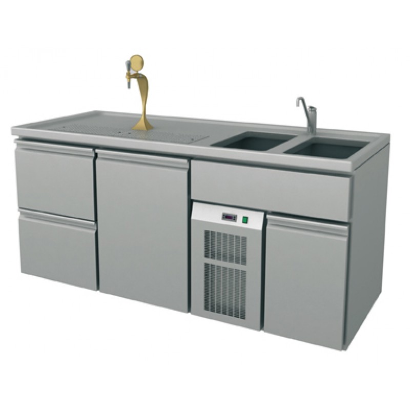 Comptoir � bar, 1965 x 700 x 900 mm, refroidissement ventilé, 500 W, 1 porte pour bouteilles ou fûts, 2 tiroirs pour bouteilles, 2 éviers � droite, robinet et pompe � bière non inclus