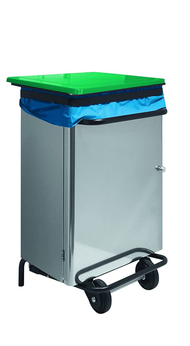 Stainless steel waste bin - 90 L - Pedal operated opening, green lid