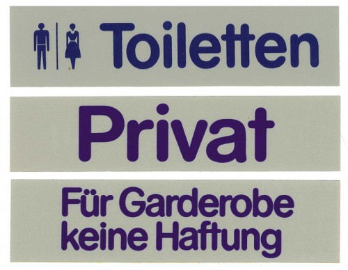 Signs for doors and rooms, self-adhesive, 16 x 14 cm, blue letters on silver coloured background, water and weather resistant.